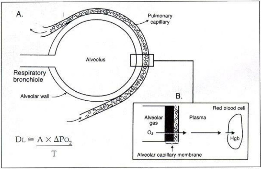 The final component of the full PFT exam is the measurement of Duffusion Capacity of Carbon Monoxide (DLco). Due to its rich capillary bed associated with the large surface area of the alveoli, the lung is very efficient at oxygen delivery and CO2 extraction. In addition given the presence of hemoglobin binding of oxygen there is alway a concentration gradient for the movement of oxygen across the aveolar membrane. The DLco maneuver is simialr to nitrogen washout in that at FRC the patient is switch from breathing room air to a bag containing a low but known concentration of carbon monixide. The patient is instructed to perform an inspiratory capacity maneuver and hold that breath for 10 seconds then exhale to residual volume. If there are issues with the transfer of CO, there will be more CO in the exhaled breath indicating diffusion impairment. CO is chosen since its affinity for Hemoglobin is 100 times higher than oxygen, therefore the absorption is not flow but diffusion limited.