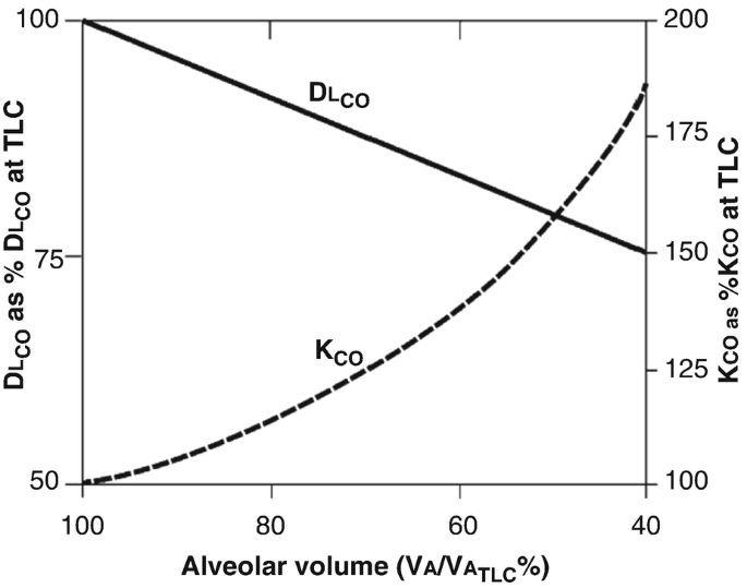 Because the relationship between the Va and DLco is much more complex than a proportional reduction, substituting the DLco/Va for the determination of diffusional impairment is controversial and not advised. But given the impact of the inspiratory volume on the degree of CO absorption the use of only the raw value of DLco is also fraught. My approach is to use the Va as a quality control measure. If Va is similar to the precent predicted ideally for IC, but secondarily FVC or TLC, the DLco is a reasonable measure of diffusional impairment. If Va is 5-10% less than these parameters I include a proviso that a portional of the reduction in DLco is due to technical factors.