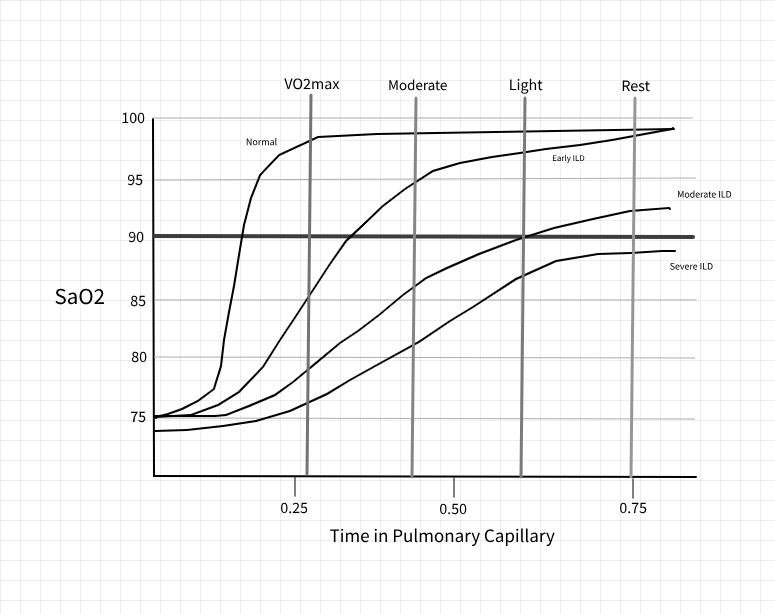 In situations where there is impairment in the interstitial surface, the time for the red cell to become completely saturated lengthens. Eventually is will reach the point where even at rest the red cell will leave the pulmonary circulation and not be completely saturated. This is an indicator of fairly advanced disease.