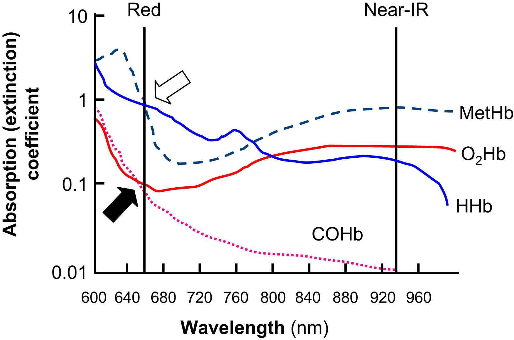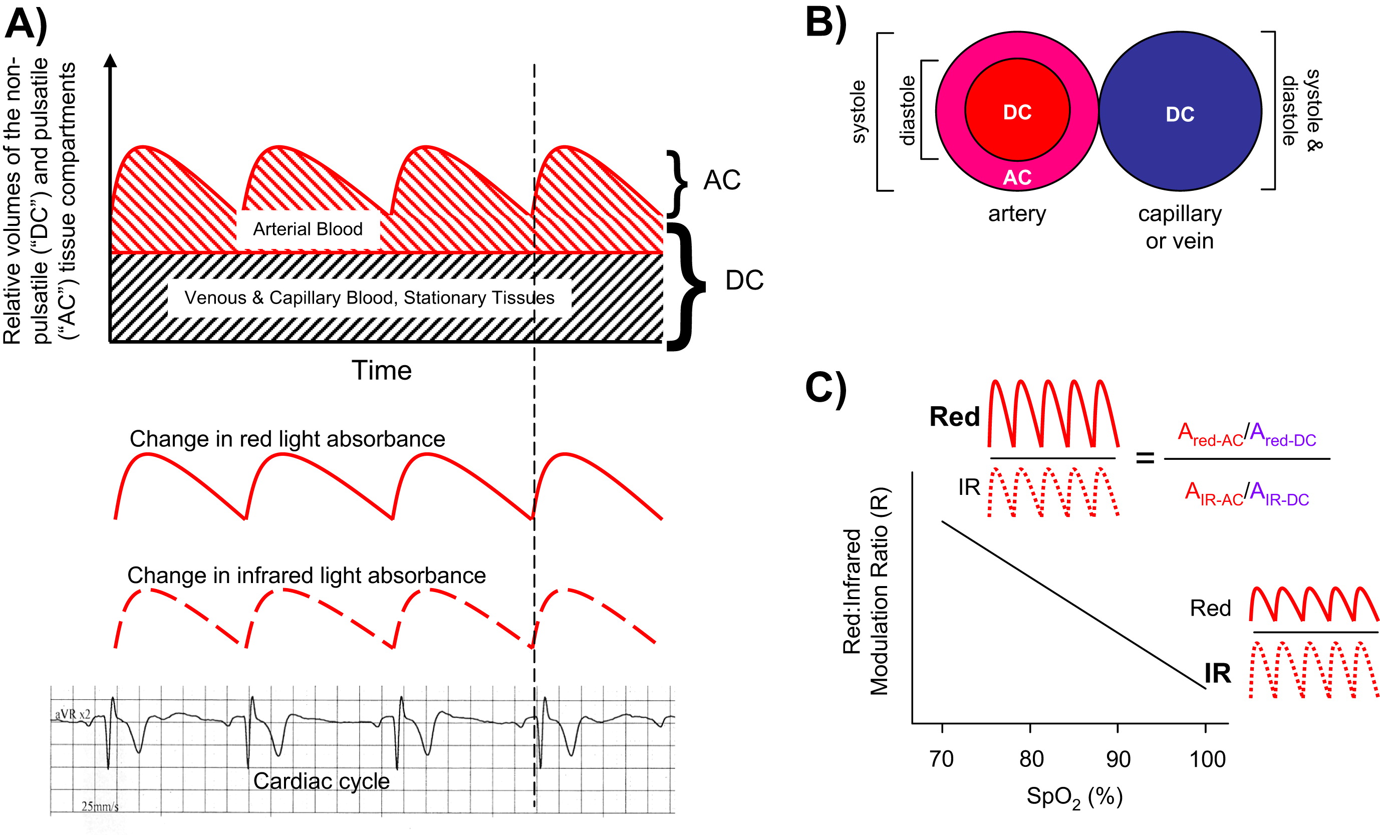 All pulse oximeters on the market today rely on the diffential absorption of oxygenation and deoxygenation blood in the red and near infra-red region. In addition during the course of a cardiac cycle the amount of blood in the venous system is relatively static while the arterial blood volume changes with each systolic ejection. By measuring the changes in light absorption during the cardiac cycle, the pulse oximeter is able to isolate the arterial blood component and calculate the saturation of hemoglobin with oxygen (SaO2).